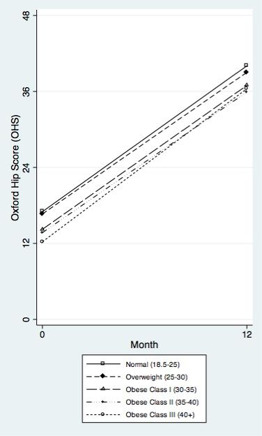 The effect of body mass index on the risk of post-operative complications during the 6 months following total hip replacement or total knee replacement surgery.