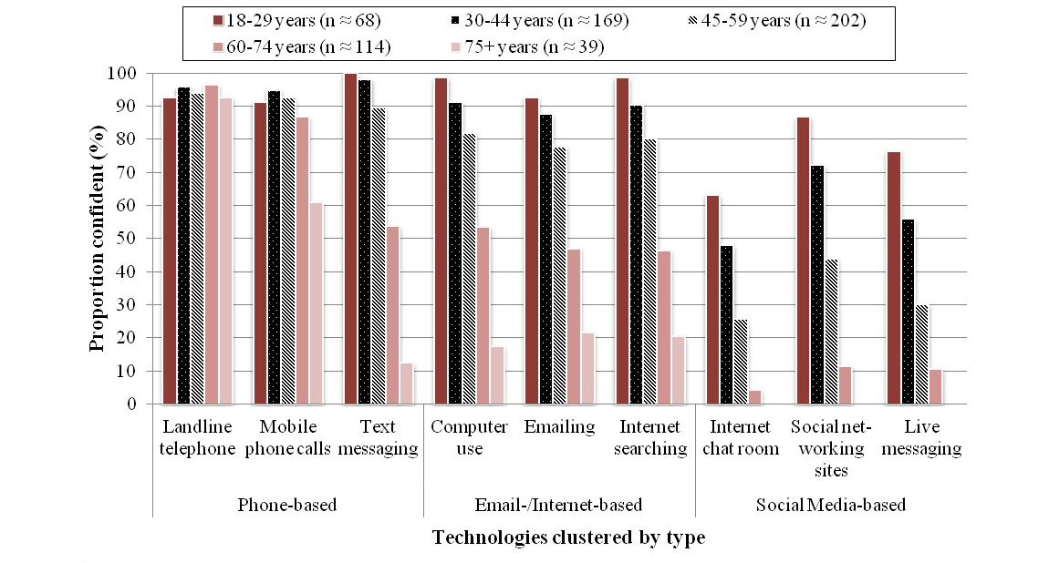 shows the proportion of depression respondents reporting they were “Extremely confident” or “Quite confident” using the various technologies across the different age groups. The pattern of findings was similar among the CVD risk group (data not shown). Least associated with age were the phone technologies, which received high confidence ratings by all age groups. The one exception was low confidence in text messaging by the oldest age group. Although confidence using email/Internet and social media technologies consistently decreased with age, more than half of the respondents in all age groups (except the over-75s) reported confidence using email/Internet technologies. Conversely, confidence using social media technologies was strongly related to age, with only the younger age groups expressing confidence.