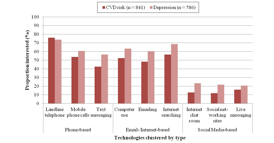 shows which individual technologies respondents were more or less interested in using, with ratings of interest dichotomized into some versus no interest for ease of interpretation. This shows that patients with depression were more interested than those with CVD risk in nearly every form of technology for telehealth. There was a clear preference for the landline telephone (1072/1428, 75.07% overall), followed by finding information on the Internet (876/1427, 61.39% overall). Again, there was hardly any interest in the social media technologies. Averaging across the technology types and both patient groups (CVD risk and depression), there was moderate interest in using phone-based (854/1423, 60.01%) and email/Internet-based (816/1425, 57.26%) telehealth, but very little interest in social media (243/1430, 16.99%).