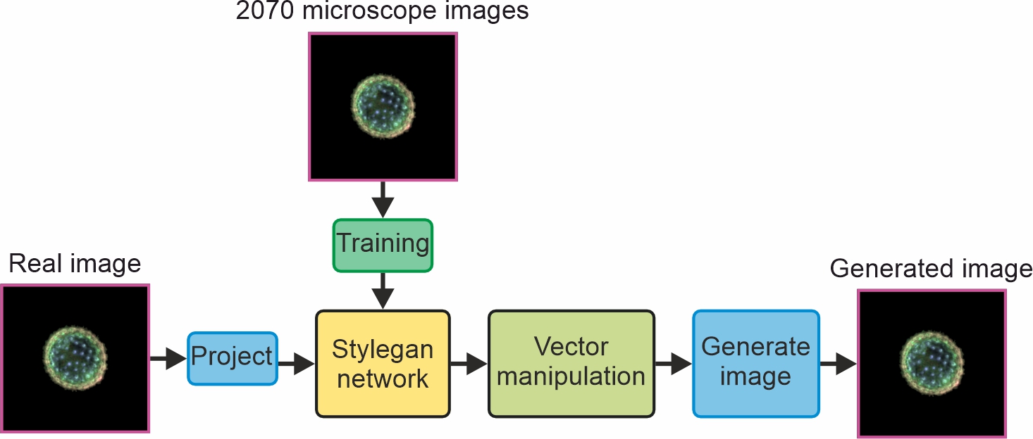Dataset supporting the publication "Pollen image manipulation using latent space" published in Frontiers in Plant Science This dataset contains: Figure 1. Block diagram concept of the study Figure 2. Schematic of the StyleGAN neural network (formed of the mapping and synthesis networks) for generating images, and of then the use of a CNN for subsequent classification of the generated images. Figure 3. Diagram of StyleGAN with 3 networks (Left) The mapping network transforms a random input into a style signal, controlling various aspects of image generation. (Middle) The synthesis (generator) network uses the information (A) from the mapping network to generate images from low to high resolution. It also incorporates random noise (B) to introduce variations and fine details. (Right) The discriminator network compares real and generated images, updating the weights of all networks through adversarial training to enhance performance. Figure 4. Graph showing the accuracy of training and validation progress during training of the CNN. Figure 5. Schematic of methodology of projecting an image into latent space, by generating random z vector, generating an image then comparing that image with the projected to obtain the suitable vector in latent space. The vector is then manipulated via adding or subtracting a vector before the synthesis network generates a new image. Figure 6 Histogram of distribution of taxa in training dataset and generated dataset (as predicted by CNN). Figure 7. Generated images of pollen grains created through latent w-space vector manipulation, showing the addition of a ‘size’ vector (-100%, -50%, 0%, +50%, +100%) added in the horizontal direction and a ‘spike’ vector (-100%, -50%, 0%, +50%, +100%) in the vertical direction, to generated images of (a) Knightia and (b) Coriaria. Each generated image also shows the predicted pollen taxa and predicted confidence, as well as the pollen size in pixels. Labelling is omitted from of images without any visible grains. Figure 8. Generated images of pollen grains created through latent w-space vector manipulation, showing the addition of a ‘size’ vector (-100%, -50%, 0%, +50%, +100%) added in the horizontal direction and a ‘round’ vector (-100%, -50%, 0%, +50%, +100%) in the vertical direction, to generated images of (a) Metrosideros and (b) Disphyma. Each generated image also shows the predicted pollen taxa and predicted confidence, as well as the circularity of the pollen grain. Labelling is omitted from of images without any visible grains. Figure 9. Generated images of pollen grains created through latent w-space vector manipulation, showing the interpolation of projected images between (a) Knightia and Kunzea (b) Brachyglottis repanda and Citrus. Each generated image also shows the predicted pollen taxa and predicted confidence.